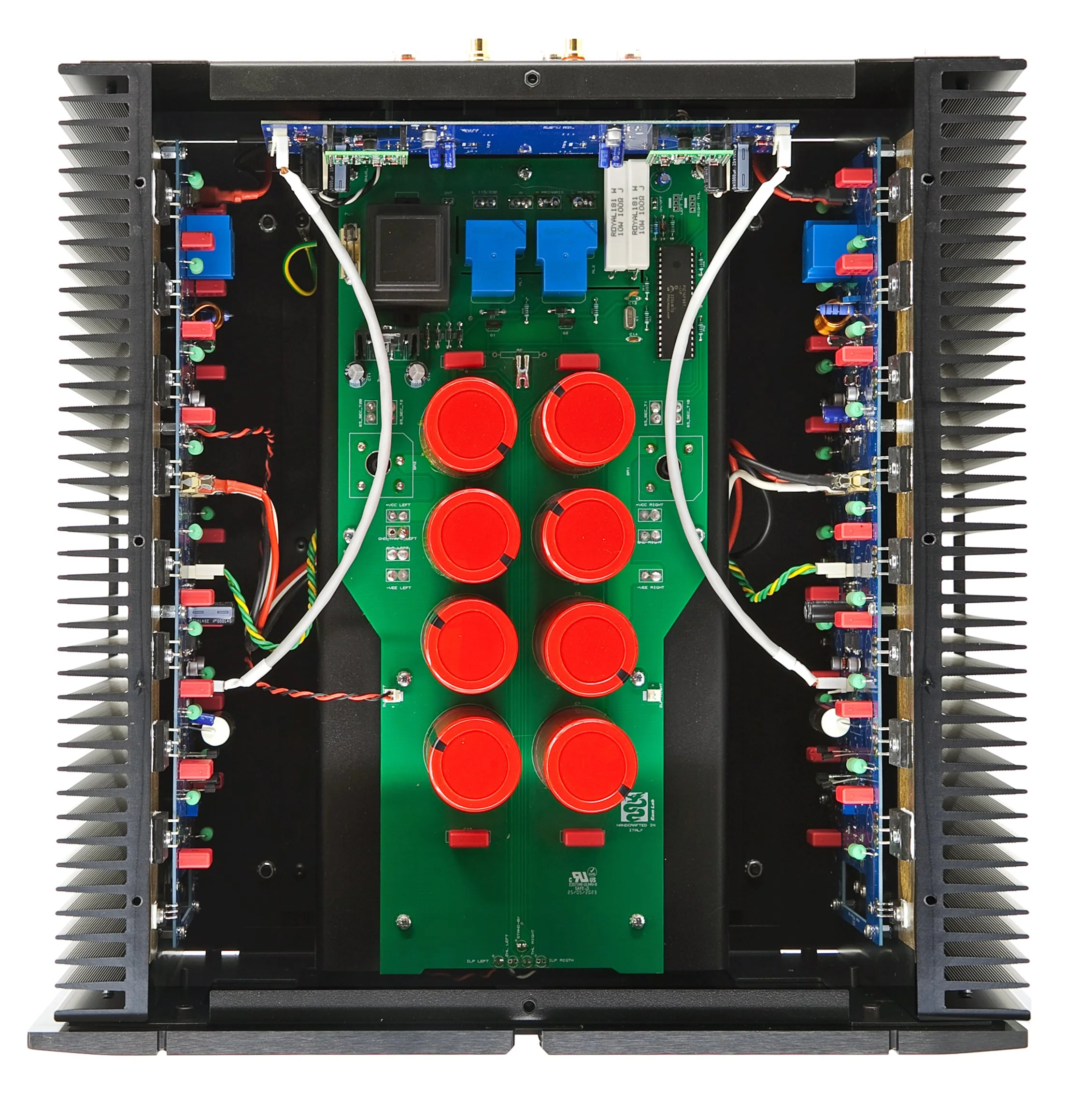 Il cuore dell’amplificatore è costituito da due trasformatori toroidali da 1000 VA, meccanicamente isolati e schermati tramite una robusta copertura in acciaio, progettata per minimizzare le interferenze elettromagnetiche sui delicati stadi di amplificazione. Questo accorgimento costruttivo contribuisce in modo determinante alla riduzione del rumore di fondo, permettendo una riproduzione sonora pulita, silenziosa e altamente definita.